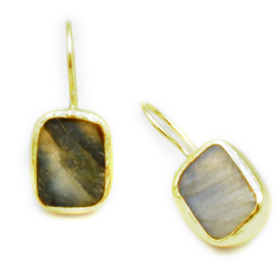 Τα ARLEN earrings αναδεικνύουν το “φαινόμενο λάμψης” του λαμπραδορίτη — μια πέτρα που αλλάζει χρώμα ανάλογα με το φως, από γκρι μέχρι βαθύ μπλε.