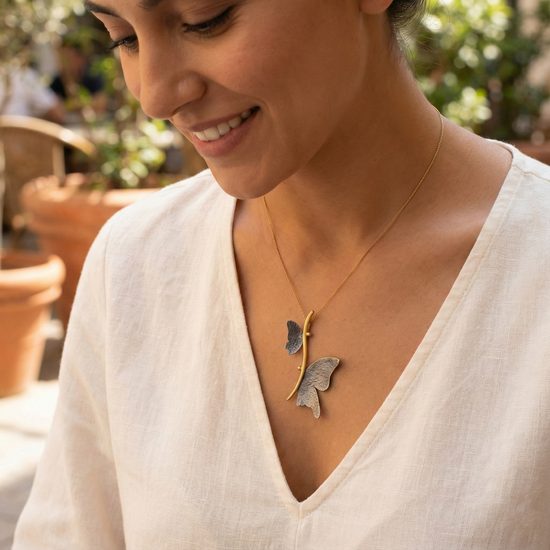 Το Thaloria αποτυπώνει τη μετάβαση και την εξέλιξη μέσα από δύο πεταλούδες που κινούνται αρμονικά σαν να ζωντανεύουν πάνω στο δέρμα. Ο συνδυασμός του οξειδωμένου μετάλλου με τις χρυσές λεπτομέρειες προσφέρει μια καλλιτεχνική, οργανική αισθητική — ιδανική για όσους αγαπούν τα κομμάτια με χαρακτήρα και συμβολισμό. Ένα statement κολιέ που μαγνητίζει χωρίς προσπάθεια.